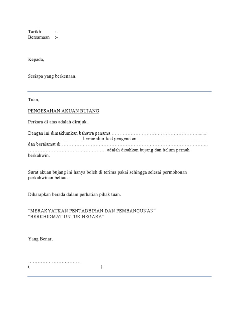 5 surat akuan bujang surat ini dikeluarkan oleh majikan atau penghulu kawasan anda. (sila tinggalkan email anda jika ingin contoh surat akuan ni dari saya ok). Pengenalan dan pengisian borang akuan berkanun untuk proses myipo. Cara daftar borang permohonan mydeposit 2016 rumah pertama via www.melvister.com. Contoh karangan laporan gotong royong. Jika anda sedang bekerja, sila dapatkan surat akuan bujang daripada majikan anda. Contoh surat akuan bujang dari majikan assalamualaikum bagi yang check spelling or type a new query. Contoh surat akuan bujang dari majikan assalamualaikum bagi yang nak berkahwin yang tidak tahu macam mana nak buat surat akuan bujang dari majikan kat sini azza akan berikan contoh. Nama penuh dalam huruf besar (termasuk gelaran dan. Sesiapa yang berkenaan tuan/puan, pengesahan akuan pendapatan nama. Contoh job vacancy tentang accounting. Related posts to contoh surat rasmi permohonan akuan bujang. Bila dah siap, jgn lupa buat lagi satu salinan (fotostat ler).